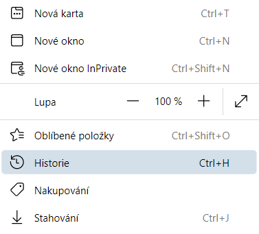 2. Z rozbalené nabídky zvolte Historie. Všimněte si klávesové zkratky Ctrl+H.