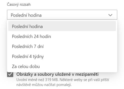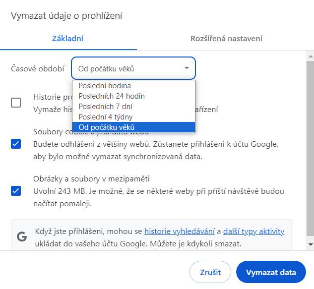 Vymazání cache a souborů cookie